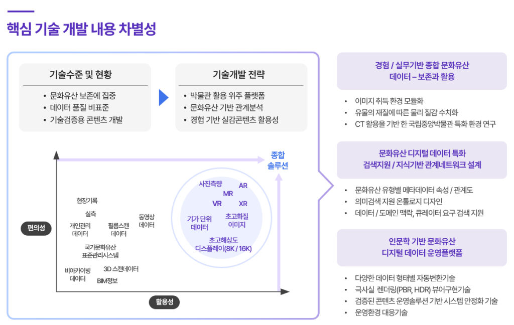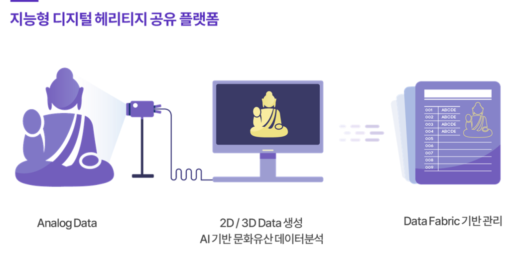 문화유산의 디지털 표준 선도를 위해 인공지능 기반 데이터 생성, 가공, 변환이 가능한 플랫폼으로, 전시/교육/콘텐츠/게임 등에서 누구나 쉽게 사용 가능한 환경을 제공하는 문화유산 공유 플랫폼입니다.