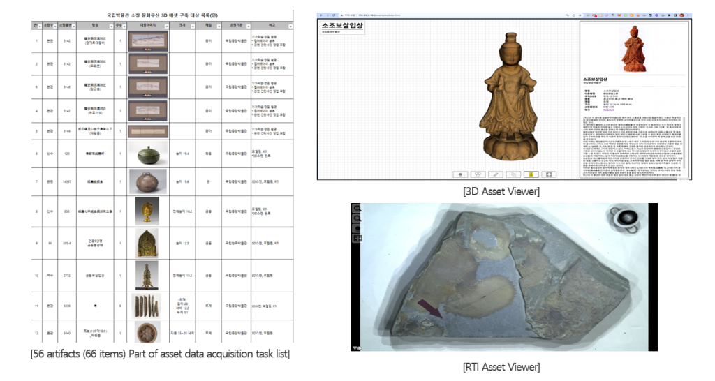 Acquisition work for asset data has been conducted on 56 artifacts (66 items), obtaining 3D assets (50 artifacts, 60 items), RTI (10 artifacts, 15 items), and gigapixel images (5 artifacts, 5 items)