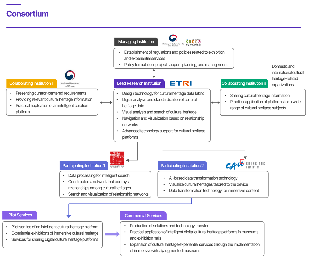 Relationship diagram illustrating the relationships among participating institutions in the management of MUCH research and development activities, including the objectives of each institution’s specific tasks.